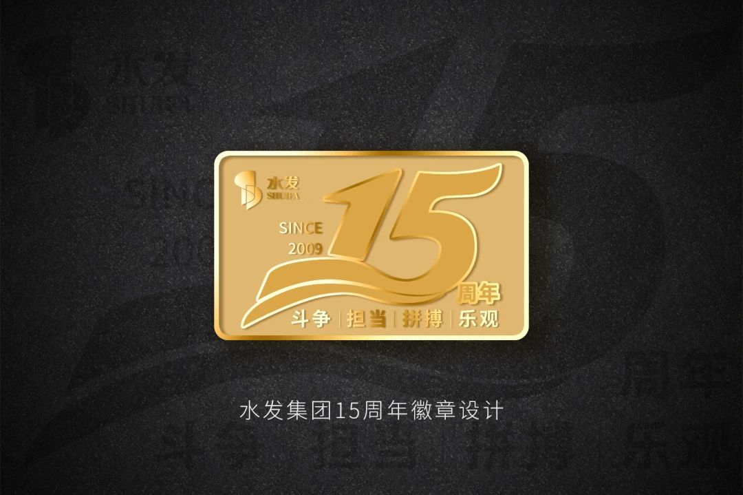 水發(fā)集團(tuán)因水而興,從2009至2024年已走過(guò)15個(gè)春秋,數(shù)字“15”結(jié)合流動(dòng)的水來(lái)設(shè)計(jì),并結(jié)合了“斗爭(zhēng)、擔(dān)當(dāng)、拼搏、樂(lè)觀”的新水發(fā)精神,金色的徽章更顯品質(zhì)。