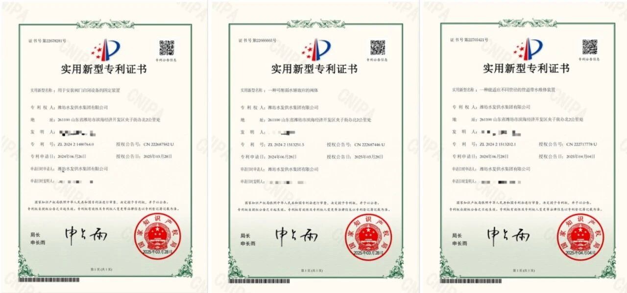 此外,濰坊區(qū)域還新增3項實用新型專利,涵蓋設(shè)備安裝、系統(tǒng)防護(hù)與維修維護(hù)等多個應(yīng)用場景:《用于安裝閥門啟閉設(shè)備的固定裝置》提升了復(fù)雜環(huán)境下的施工效率;《一種可削弱水錘效應(yīng)的閥體》增強(qiáng)了供水系統(tǒng)穩(wěn)定性;《一種能適應(yīng)不同管徑的管道帶水維修裝置》實現(xiàn)了高效不停水維修。三者與前述發(fā)明專利、軟著協(xié)同發(fā)力,初步構(gòu)建起“檢測-控制-維護(hù)”的水務(wù)管網(wǎng)技術(shù)創(chuàng)新體系。